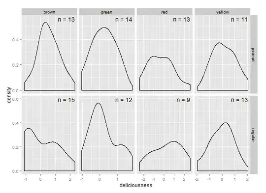 plot <- ggplot(data=mms, aes(x=deliciousness)) + geom_density() + facet_grid(type ~ color) + geom_text(data=mms.cor, aes(x=1.8, y=5, label=n), colour="black", inherit.aes=FALSE, parse=FALSE)