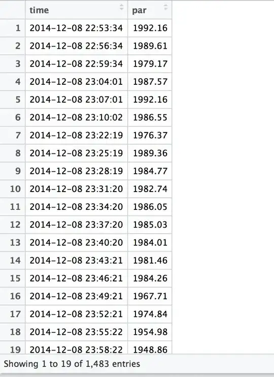 I have data frames consisting of two columns: light intensity (par), and time, with each row representing a 'snapshot' in time: