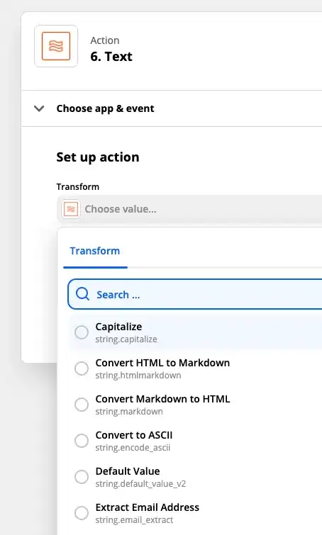 We do a similar thing with our Formatter by Zapier app, where the "Text" category has a ton of little functions: