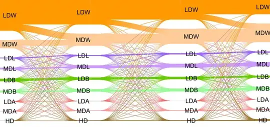 I'm using Riverplot to create Sankey plots and placing them in one plot to create a continuous look with three plots. My problem is that I only want node labels on the outmost left and right nodes, not inside.