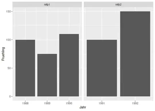 The bars which represent precipitation sums of a season ("Frühling") for each year ("Jahr") ended up lumped into one bar per group (30 years in each of the two reference periods "refp"). Actually, they should be displayed as 30 bars next to each other grouped as "refp1" and after a small space or in another box then 30 bars next to each other grouped as "refp2". I have struggled too many hours now and am still totally clueless.