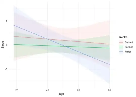 In other words, for my cplot() line at the end of the code block, how can I get the plot to show the predicted values for increments of 'age' by the levels of 'smoke'?