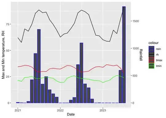 As you can see from the plot, the secondary y-axis starts at -500. The 0 rainfall value is shown as -500 which ideally should be left out in the barplot.
