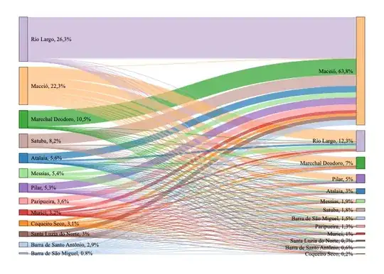 it's the first time I'm using R so sorry for stupid mistakes. I need to do a Sankey Chart to display flows between cities in a Metropolitan Area, but I am not satisfyied with the how the graph looks. I would like the labels to be outside the Sankey and to the cities to be organized from byggest to smallest flow.