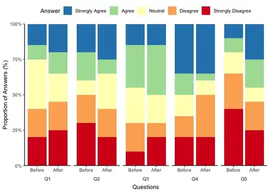 Issue 2: I have Before and After responses for each of 5 questions and I cannot figure out how to have "Before" "After" underneath each stacked plot, and then below that have "Question 1".