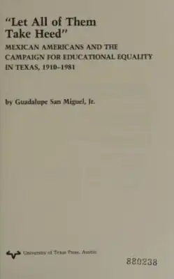 "Let All of Them Take Heed": Mexican Americans and the Campaign for Educational Equality in Texas, 1910-1981 is a non-fiction book by Guadalupe San Miguel, Jr., published by University of Texas Press in 1987. Let All of Them Take Heed argues that Mexican-Americans in the period saw education as central to success in the United States, with participation in League of United Latin American Citizens being key evidence.[1] The book argues against the idea that the ethnic group did not place value in education.[2] According to Richard A. Garcia of Santa Monica College, "Let All of Them Take Heed" "is the first major work to give credence to the reality of a strong Mexican American civil rights movement[...]"[3]
