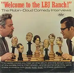 "Welcome to the LBJ Ranch!" is a political satire comedy album by Earle Doud and Alen Robin, released in November 1965 on Capitol Records. The vinyl album uses out-of-context recordings of political figures apparently responding to interview questions fabricated by the comedians. Television comedy writers Earle Doud and Alen Robin conduct some of the "interviews"; other interviewers are news announcers John Cameron Swayze and Westbrook Van Voorhis, with WPIX anchorman John St. Leger, all of whom were recorded speaking questions written by Doud and Robin. Audio tape was edited to bring together the comedy questions and the recordings of political people, with laugh track sound effects added by Bob Prescott.