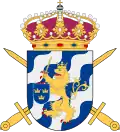 The coat of the arms of the Älvsborg Regiment (I 15/Fo 34) 1977–1994 and the Älvsborg Brigade (Älvsborgsbrigaden, IB 15) 1994–1997. Blazon: "The regimental badge, with waves six times divided bendy-sinister azure and argent, a double-tailed crowned lion rampant or, armed and langued gules, in dexter forepaw a sword or and in sinister a shield azure charged with three open crowns or placed two and one. The shield surmounted two muskets in saltire, or".[6] The coat of arms of the Älvsborg Regiment (I 15/Fo 34) 1994–1997 and the Älvsborg Group (Älvsborgsgruppen) 1997–2004. Blazon: "Azur, the regimental badge, three waves bendy-sinister argent, a double-tailed crowned lion rampant or, armed and langued gules, in dexter forepaw a sword or and in sinister a shield azure charged with three open crowns or, placed two and one. The shield sur-mounted two swords in saltire, or."[6]