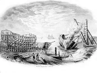 The rope factory was renewed in 1837 after plans by architect Pehr Johan Gylich; it was further extended in 1842.[1] The factory production was used at the yard and also sold outside. The building was the longest in Finland at its time.[4] During the 1840s the yard experienced an increased order intake, mainly from Russia, and the yard area was enlarged towards downstream of the river[2][5] in 1846, when the company bought a lot next to the Turku Castle.[2] Also a new slipway equipped with a mechanical winch was built[1][5] primarily for reparations of increasingly common steamships.[1]