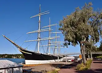 It is the centrepiece of the museum since 1957 at its present mooring in the western harbour of Mariehamn, after sailing for over 70 years.[3][5][16] Cabinets in the museum display curios collected by the sailors from different lands; including piranhas and sharks’ jaws, shells and corals. A unique display is a "Jolly Roger" pirate's flag which is one of a kind.[8]