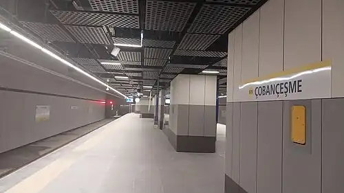 Çobançeşme is an underground station on the M9 line of the Istanbul Metro.[1][2] It is located under Sanayi Street in the Yenibosna Central neighbourhood of Bahçelievler. It was opened on 18 March 2024, with the extension of M9 from Bahariye to Ataköy.[1]