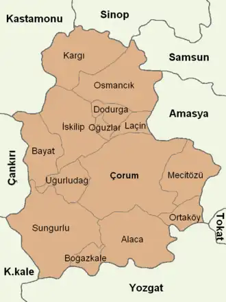 Çorum (Turkish: Çorum İli) is a province in the Black Sea Region of Turkey, but lying inland and having more characteristics of Central Anatolia than the Black Sea coast. Its area is 12,428 km2,[2] and its population is 524,130 (2022).[1] Its provincial capital is the city of Çorum, the traffic code is 19.
