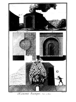 Five hundred years ago, lime was made by masons in small upright ovens situated either near the quarry or close to the building site, after transporting the limestone rocks and kindling there. Crushed limestone rocks and firewood were laid in alternate layers so as to facilitate calcination of the stones, and obtain an oxyde of calcium. The ovens were about ten metres high and, not resisting the heat, could be used only once. Some farmers used the same method at the beginning of the 20th century.