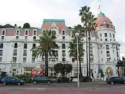 In 1912 Niermans created the Hotel Negresco on the Promenade des Anglais in Nice for the Romanian hotelier Henri Négresco. He designed it for the reception of royalty, as with other hôtels-palais on the Riviera. This was a time when the Riviera was at the height of its popularity as a resort for the wealthy or high-born, two years before the outbreak of World War I.[3] It was a rectangular building that occupied a full block of the Promenade des Anglais with four hundred rooms, each with a private bath. Two cupolas at the east and west corners were said to have been inspired by the breasts of La Belle Otero. The building had modern features like electric lights, elevators and telephones. A huge ballroom was roofed by a glass dome. Eight kings were present when the hotel opened in November 1912.[11]