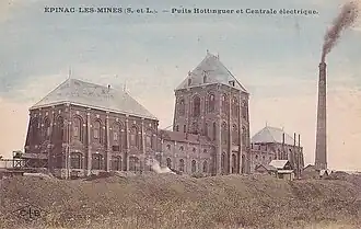 The buildings of the Hottinguer shaft were constructed between 1872 and 1876. They housed a revolutionary atmospheric extraction system: a piston moving within a 558-meter-high tube, machined in Le Creusot (an original technique developed by engineer Zulma Blanchet), rather than traditional cables, which at the time could not reach such depths (over 600 meters). After its closure in 1936, the site was converted into a paint factory before falling into abandonment at the end of the 20th century due to a fire.[16] It was listed as a historical monument on November 26, 1992.[17] The Malakoff tower and its wings have been under renovation since late 2012. The construction of a photovoltaic power plant near the old buildings was planned for 2016.[18]