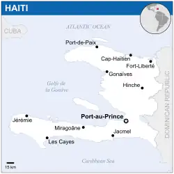 Laveaux was placed in charge of the northwest part of the colony, based in Port-de-Paix.[8] His commander, General Rochambeau, praised his conduct in taking the fort of Ouanaminthe on the Spanish border in the northeast, which was being held by black slaves in revolt.[3] The city of Cap Français (Cap-Haïtien) at this time was in turmoil. Some of the troops helped the white settlers restore the slave order in the city, while others, particularly those under Laveaux, supported the civil commissioners and wanted to protect the mulattoes, a prime target of the planters.[9] Laveaux was promoted to the command of the Northern province.[9]