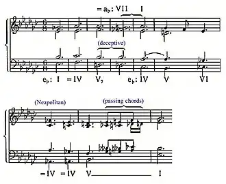 Like all of Chopin's other études, this work is in ternary form A–B–A. The strict periodic structure contains eight-bar periods—two in the A section, forming a regular 16-bar period, three in the middle one and in the final A section a single eight-bar period expanded by five bars.[7] The harmonic relationships in the first eight bars, marked by a deceptive twist to bar 4 and a Neapolitan chord in bar 7, are shown in a harmonic reduction.[8] Bars 9–16 repeat the same progression, ending with an E♭ minor perfect cadence.