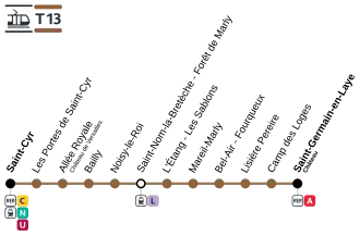 Île-de-France tramway Line 13 Express (T13 Express; French: Ligne 13 Express du tramway d'Île-de-France, known as the Tangentielle Ouest and Tram Express Ouest in the planning phase) is a suburban tram-train line in Yvelines, west of Paris, which opened on 6 July 2022.[1][2][3] The line is operated by Transkeo T12-T13, a joint venture 51% owned by Keolis and 49% by SNCF Voyageurs, but operation will be taken over by RATP Cap Île-de-France by 2026.[4]