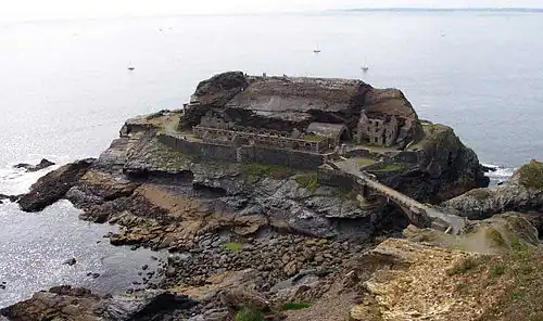 Îlot des Capucins (Islet of the Capuchins; Breton: Enez ar Gapusined) is a rocky islet at the foot of a cliff in the commune of Roscanvel on the Crozon peninsula. Its name comes from a rock near the island, shaped like a praying monk. It has a strategic position at the entrance to the goulet de Brest and so a fort sited on it controlled the whole of Camaret Bay, with views stretching from pointe du Grand Gouin (to the southwest), to fort de Bertheaume (to the northwest).