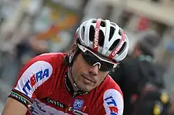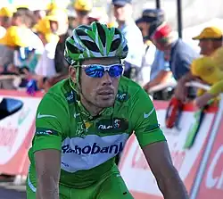 Óscar Freire Gómez (born 15 February 1976) is a Spanish former professional road bicycle racer. He was one of the top sprinters in road bicycle racing, having won the world championship three times, equalling Alfredo Binda, Rik Van Steenbergen, Eddy Merckx and Peter Sagan. In the later years of his career, he became more of a classics rider. He won the cycling monument Milan–San Remo three times, the green jersey and four stages in the Tour de France and seven stages of the Vuelta a España, throughout a successful career.