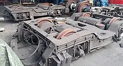 Completely new bogies were developed for the units. The motor bogies have a closed frame. The braking and tractive forces are transmitted by a rubber-mounted bogie pivot. The frames of the running bogies are designed as open H-frames; a tractive force link is used for power transmission. The driving wheelsets are braked by wheel disk brakes. There are also block brakes on the driving wheelsets, which have only been used as anti-skid brakes since the main upgrade in 1993. The wheelsets are each fitted with two shaft disk brakes. In addition to the mechanical brakes, the railcars also have an externally excited, thyristor-controlled electrodynamic high-performance resistance brake, which is actuated in addition to the compressed air brake, whereby the brake control primarily accesses the electrodynamic brake. The braking energy generated is converted into heat in the air-cooled braking resistors located on the roof.