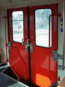 The boarding compartments are very large with a width of up to 2600 mm to allow passengers to change quickly. The entrance doors are double-leaf swing and sliding doors and are air-operated. They have a clear width of 1400 mm. The doors are opened and closed centrally from the driver's cabs. Only after release can they be opened by passengers by briefly pulling the snap handle. There are two steps in the door area. Originally, the vehicles had side-selective door control without automatic door closing; the doors were closed by the driver after dispatch (similar to the Vienna subway). In order to prevent the passenger compartment from cooling down during the longer turnaround stops, a button was attached to each door with which the door could be closed.
