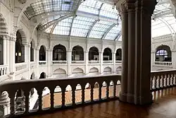 After 1890, Lechner increasingly turned to Hungarian folk culture and its Asiatic roots, as his inspiration in his aim to characterise a Hungarian national architectural style. His relationship with Zsolnay flourished and throughout the rest of his career he began to make free use of the company's stoneware tiles, beginning with the Thonet House in Budapest, Váci utca (1889) with its steel structure and the façade covered with Zsolnay terracotta. He followed this up with the Museum of Applied Arts (1893–96), a commission for which he and Pártos won the design competition in 1891. The building's glazed tiles, the pyrogranite decorative elements, and the pierced floral motifs testify to Lechner's newfound Hungarian and Persian folk influences, as well as the cladding theories of German architectural theorist Gottfried Semper.[6] The building represented a significant break from the historicism - mostly Baroque- and Gothic-revival architecture - popular in Budapest at the time. Though it encountered a mixed reception amongst critics, it was triumphantly inaugurated in time for the 1896 celebrations of the millennium anniversary of the Kingdom of Hungary. The building is today considered the first complete statement of Hungarian Szecesszió (Art Nouveau) architecture, and it formed a counterweight in the Hungarian half of the Austro-Hungarian dual monarchy to the work of the Secession developed later in Vienna around Otto Wagner, Joseph Maria Olbrich, Gustav Klimt, and others.