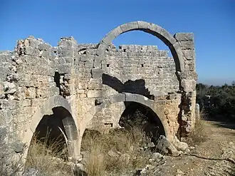 The house ruins in the north of the site are examples of the polygonal and Byzantine masonry. One house is a peristyle house. The foundations of some buildings are carved rock. There are sarcophagi along the road. At the center of the site there are ruins of a basilica. The basilica with three naves and a transept is backdated to about 500. There is a smaller church situated about 500 metres (1,600 ft) south of the basilica.[2]