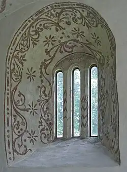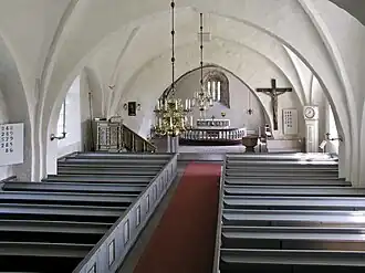 The baptismal font in red sandstone is from the 12th century and is considered to have been made by the workshop of an anonymous stone master referred to as Bestiarius. The triumphal cross is from the 15th century. The pulpit was manufactured in 1649 by mäster Päder Knutzsson. [3][4]