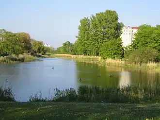 Öresundsparken (English: The Öresund Park) is a park in Malmö, Sweden. The park was built in the 1920s to fill the area beside the railway line. It was opened in 1924 and consists mainly of three ponds. The park is a long narrow area between Ribersborgsstranden and Limhamnsvägen. As early as 1889, the railway, the so-called Sillabanan, was built between Limhamn and Malmö. It ran a bit off the coastline at the time. The park was built in the 1920s to fill in the area inside the railroad. It was inaugurated in 1924 and consists mainly of three ponds.