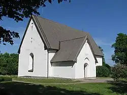 The currently visible church dates from the 15th century, but was without doubt preceded by another church on the same site. When this first church was built is not known, though it must have been at the latest during the early 14th century since several of the present church's fittings date from this time and originate from the older church.[1] The church is a so-called aisleless church, with a southern church porch a northern sacristy. The entrance through the cemetery wall is through a preserved medieval lychgate.[2]