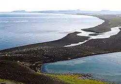 Öxarfjörður is encircled by mountain ranges to the west and east, and the Gjástykki [ˈcauːˌstɪhcɪ] lava fields and an area with sand deposited by the glacial river Jökulsá á Fjöllum in the south. The only village in the area is Kópasker with about 130 inhabitants.[1] The Mid-Atlantic Ridge runs through the western part of the fjord before going underwater again. Öxarfjörður went deeper inland in earlier geological times but the glacial river Jökulsá deposited sands from the highlands on a triangular area of about 300 km2 called Sandur [ˈsantʏr̥]. Sandur is still trenched by the delta of Jökulsá which is constantly changing its riverbed. There are two big lakes on Sandur, Vikingavatn and Skjálftavatn [ˈscaul̥taˌvahtn̥], the latter one formed by an earthquake in 1976, over the course of which some houses in the area were destroyed.