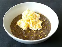 Øllebrød (lit. 'beer bread') is a traditional Danish dish. It is a porridge or thick bread soup made of sourdough rye bread (rugbrød) and beer (often hvidtøl).[1] These ingredients give it a slightly tangy, caramelly, full taste.[2] Øllebrød is common in Danish cuisine and is also part of Scanian cuisine, which was formerly a Danish province.[2]