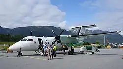 Widerøe introduced the 50-passenger de Havilland Canada Dash 7 on some routes between 1985 and 1988. There were 18,138 passengers in 1985 and 24,150 two years later. This and the use of the Dash 7 caused the terminal to be upgraded in 1988. New navigational aids were installed in 1987, including a localizer and a new radio beacon, lowering the visual range to 550 meters (1,800 ft). Further improvements were made with the new runway lighting in 1989.[15] The Twin Otters were in 1993 replaced with Dash 8-100s. With this the flights to Ålesund were terminated and instead flights to Oslo Airport, Fornebu and Bergen Airport, Flesland were introduced. From 1997 Widerøe built a hangar at Hovden, allowing it to have a night stop there. This further helped regularity.[16]