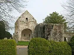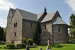 One runestone, which is designated as DR 391 in the Rundata catalogue, stands in the churchyard near the old church but was originally found in its tower. It has a runic inscription that has been transcribed into Old Norse as: Barni/Biarni ok Sibbi ok [T]ofi þeʀ resþu sten æftiʀ Kætil, faþur sin. Kristr hialpi hans siol, in English: "Barni/Biarni and Sibbi and Tófi they raised (the) stone in memory of Ketill, their father, May Christ help his soul."[8] A similar stone, DR 392, was found in the old porch wall and now stands between the old and new churches. Its inscription was transcribed as, Barni/Biarni ok Tofi ok Asgotr letu resa sten æftiʀ Sibba, broþur sin. Kristr sæl hialpi. This translates as: "Barni/Biarni and Tófi and Ásgautr had (the) stone raised in memory of Sibbi, their brother. May Christ help (his) soul." This stone also has an ornamental drawing on the reverse side depicting a propeller-shaped cross.[9] A third stone, DR 394, was found slightly buried in the churchyard and has also been placed in the area between the two churches. Its inscription was transcribed as, Øþi ok Swen ok Øþgiʀ resþu sten æftiʀ Gunulf, broþur sin goþan, ok æftiʀ Gunhild, moþur. In English this reads as, "Auði and Sveinn and Auðgeirr raised the stone in memory of Gunnulfr, their good brother, and in memory of Gunnhildr, (their) mother."[10]