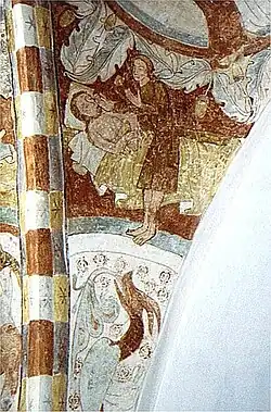 Investigations in 1908 revealed frescos in the chancel and apsis from two periods, c. 1300 and c. 1400. The latter are mostly well preserved with scenes from the Creation including images of Adam and Eve, the Judgment of Christ as well as several dragons.[1][2]