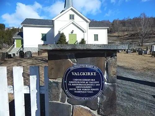 In 1814, this church served as an election church (Norwegian: valgkirke).[5][6] Together with more than 300 other parish churches across Norway, it was a polling station for elections to the 1814 Norwegian Constituent Assembly which wrote the Constitution of Norway. This was Norway's first national elections. Each church parish was a constituency that elected people called "electors" who later met together in each county to elect the representatives for the assembly that was to meet at Eidsvoll Manor later that year.[5][7]