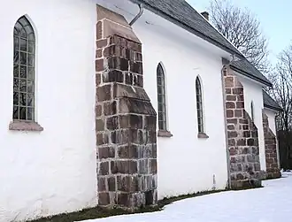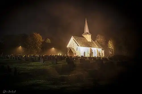 Øyestad Church (Norwegian: Øyestad kirke) is a parish church of the Church of Norway in Arendal Municipality in Agder county, Norway. It is located in the village of Rykene, on the north side of the river Nidelva. It is one of the churches for the Øyestad parish which is part of the Arendal prosti (deanery) in the Diocese of Agder og Telemark. The white, stone church was built in a long church, gothic design around the year 1200 using plans drawn up by an unknown architect. The main body of the church is whitewashed stone, but the main entrance and tower are wooden and painted red. The church seats about 250 people.[1][2]