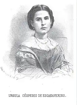 Úrsula Céspedes was born October 21, 1832, in Hacienda La Soledad, close to the city of Bayamo in the eastern part of Cuba.[1] She first received schooling in her own home where she learned music and French. In 1854, she visited Villa Clara, where she met Ginés Escanaverino, whom she married three years later. In 1858, she became a teacher. The same year she and her husband founded the Academia Santa Úrsula for women's schooling.[1]
