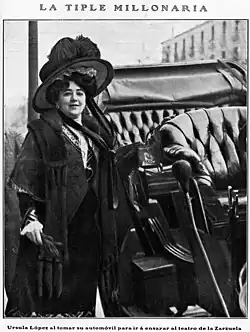 López decided to present herself as a divette of variety shows before the Spanish public, debuting at the Teatro Lírico on 15 September 1915. She performed in prominent halls and theaters in Spain, achieving success equal to or greater than she had with zarzuelas.[4] In 1918, she fulfilled some commitments abroad and then retired from the stage, dedicating herself to travel and enjoying her great fortune. In an interview with journalist Mario Hernández in the 5 September 1953 issue of Crítica magazine, she confesses: "Those jewels...that money, the wind took it away. Well, the wind did not take it so much as Paris – the Paris of that time and the theater business. I lived very well, for everything great, and that, it costs a lot of money."