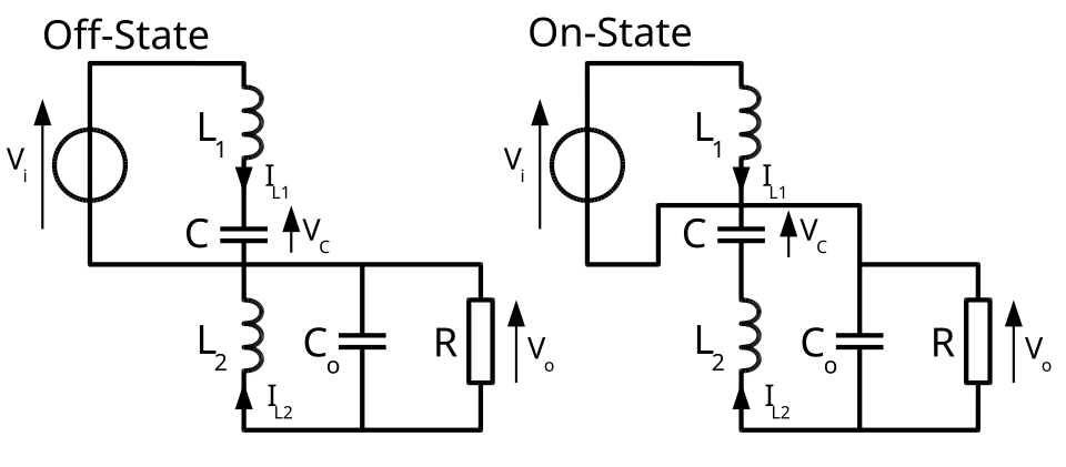 - in the off-state, inductor L1 is connected in series with Vs and C1 (see figure 2). Therefore . As the diode D is forward biased (we consider zero voltage drop), L2 is directly connected to the output capacitor. Therefore