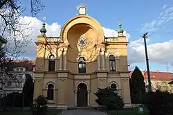 The synagogue was built between 1899 and 1900 in Moorish style, designed by architect Wilhelm Stiassny. It was used until 1939 by the local Jewish community, which was then almost totally wiped out during the Holocaust. After World War II the abandoned building saw use as a warehouse, and then (between 1970–1989) as a gallery. In 1994, however, it was returned to the Jewish Community in Prague and has recently been restored.[5]
