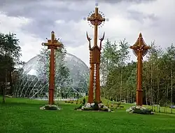 Česukai is famous for its bioenergetic pyramid built by a local resident, Povilas Žėkas. It is on the site of where he had a mystical experience as a child of seven on 20 August 1990.[2] It attracts a broad range of people such as Laima Paksienė, wife of Rolandas Paksas, who goes there every two weeks sometimes with her whole family.[3] She participated in a campaign to save the pyramid from demolition when this was proposed by Lithuanian officials.[4] Many people visit this place believing that this pyramid has healing powers.