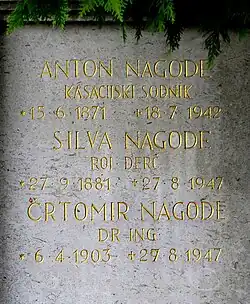 - ^ The inscription on the Nagode family gravestone in Žale cemetery has the death date 27 August 1947, also agreeing with the date of his mother's suicide, but Boris Mlakar's article states 12 September 1947.[1] Another source gives the date as 8 September 1947.[8] The plaque on the Nagode house states that he was executed in August.