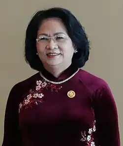 Đặng Thị Ngọc Thịnh (Vietnamese pronunciation: [ʔɗaŋ˧˨ʔ tʰi˧˨ʔ ŋawk͡p̚˧˨ʔ tʰïŋ˧˨ʔ]; born 25 December 1959) is a Vietnamese politician who served as the acting president of Vietnam in 2018 and as the 16th vice president of Vietnam from 2016 to 2021. She is the first woman in Vietnamese history to hold the Vietnamese presidency and the first female head of state in a communist country since Soong Ching-ling of China.[1]