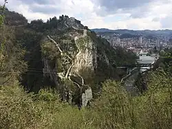 Remains of the several settlements dating from the periods of the earliest development of the civilization are found in the gorge and around it.[3] There are two major finds. The Staparska Gradina, near the Stapari village, is 11 km (6.8 mi) away from Užice. It was thoroughly explored in the late 1950s when the three levels of human habitation were discovered. The lowest and oldest is dated into the Neolithic. The middle level corresponds to the Vinča-Pločnik culture and the third one belongs to the Bronze Age. The dugouts were discovered in the oldest levels, but also the above-ground dwelling objects from the later periods. The artifacts are exhibited in the National Museum in Užice. The other find is the Rimsko groblje ("Roman cemetery"). It hasn't been explored as much as the Staparska Gradina was, but the remnants of the large, above-ground and regularly shaped stone plates. In 2015 locals build a public drinking fountain at the site.[6] In January 2019 plans were announced for the construction of the replica of the Neolithic settlement at Staparska Gradina. The settlement will include dug outs, stilt houses, artisan workshops, etc., and should be finished by the end of 2019.[7][8] Deadline was then moved to May 2020.[9] Archaeological park "Stapark" was opened on 30 July 2022.[10]