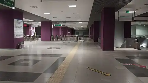 İkitelli Sanayi is an underground rapid transit interchange station on the M3 and M9 lines of the Istanbul Metro.[2] It is located in southern Başakşehir under Bedrettin Dalan Boulevard. It has an island platform serviced by two tracks. It opened on 14 June 2013 and became an interchange station with the M9 on 29 May 2021.[3]