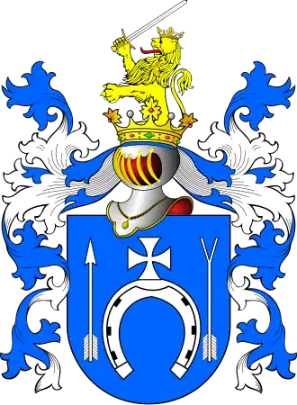 According to Długosz: red, a horseshoe argent, silver horseshoe pointing downwards, surmounted of a golden cross pattée; on the right, a silver arrow in a pale, on the left, an arrow with a pall pointing downwards; in the crest, a golden half-leaf in a crown with a sword in its right paw.[3]