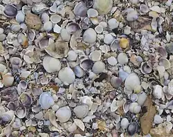 - Sand and mudflats surrounding the shore platform contain cockles, pipi (Paphies australis), crabs and Polychaete worms. Because of the cockle bed out in the sea, the cockle shells wash up high on the beach during storms. The sand can be found underneath.