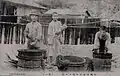 To prepare for the shimebata binding stage, 16–20 threads of about 16 meters in length, are grouped together, stretched between two posts, and covered in Igisu, a jelly-like paste made from seaweed. The threads must dry perfectly round for the shimebata stage, in order to create sharp kasuri.[13]